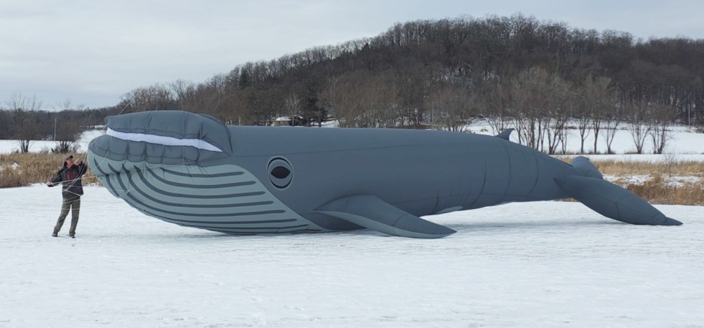 This Maxi Whale in two tone grey fills my cup. At 52 ft. long, it’s at home in the air, swimming effortlessly against the wind. This one stacks well with a number of other kites here for a monumental display. Looking forward to the next fly! Lined used: 4,500lb. Here’s a look at it flying in “the studio”.