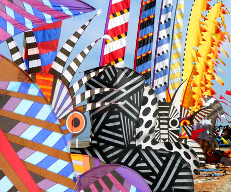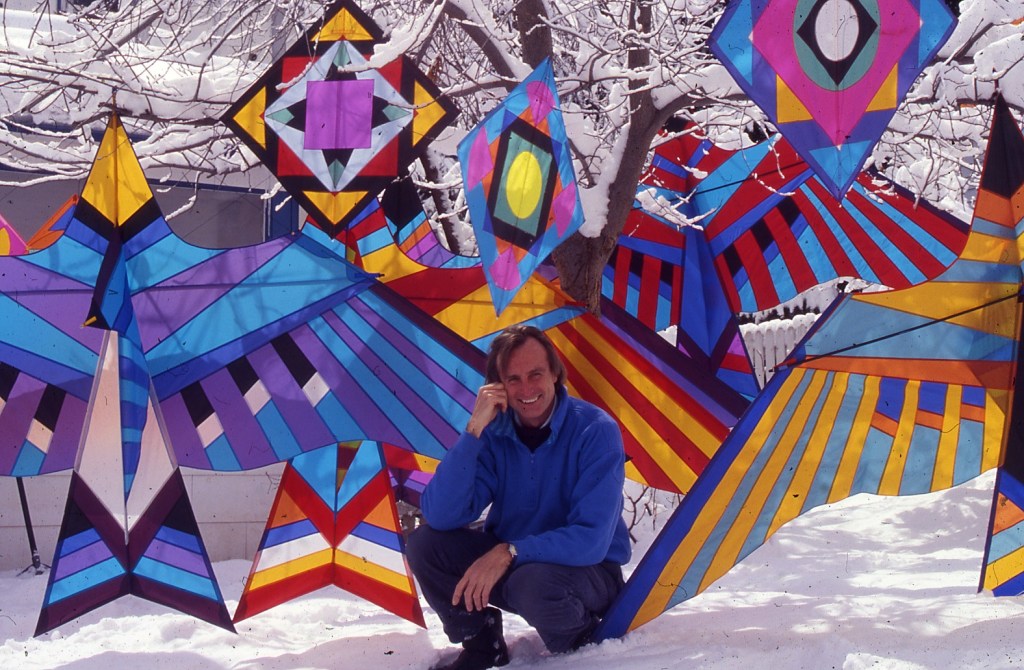 My favorite place to fly is downwind…. Sorry! Well, actually on a beach with a light onshore breeze and preferably in Italy… anywhere in Italy. Other favorite places, include festivals or just convenient places where I have some kites in hand. I love traveling to many great flying spots in Europe and enjoying the company of many kite/artist friends… places like Cervia, Italy; Dieppe, France; and Fano, Denmark. Other international favorites include flying in the traditional Hamamatsu kite festival in Japan (no western style kites permitted!), in addition to Bali, India, Indonesia, and southeast Asian countries. I love the cultures and histories of kites in those countries more than flying my kites there, obviously.
