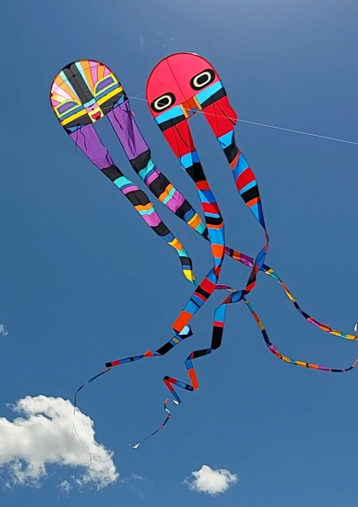 The joys of travel with kites have taken me all over the world the last 40-plus years. Still, I love to fly kites right here in Colorado as well, especially when we have an upslope wind and we’re able to fly next to the Flatiron rock formations here surrounding our town of Boulder. Oh, and also deserts… I still love flying kites in the desert. The panorama can often take your breath away. Hawks will fly over to see what the strange creature on the string is all about. The sunsets are spectacular, the quiet winds are gentle and smooth. And it’s peaceful, as no one walks over for fear of stepping on a snake.