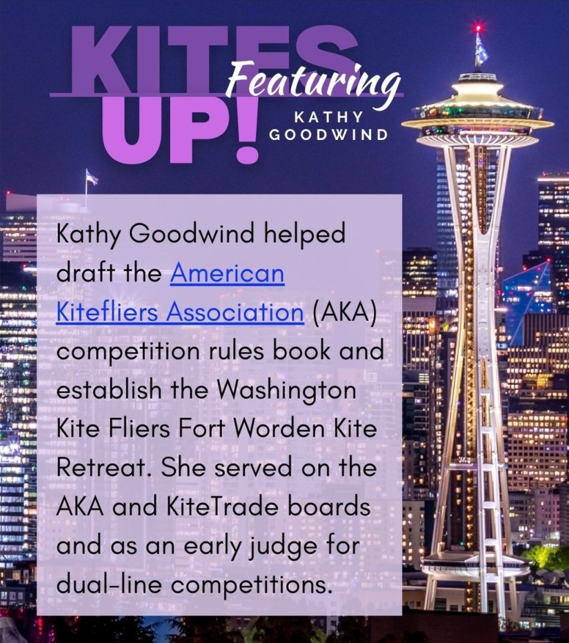 What’s in a name? EVERYTHING! And in 1979 Seattle’s Kathy Goodwin made sure of that by adding a “d” at the urging of her husband – right after the judge who’d just divorced them offered her a free name change. Known for her kite shops, Suspended Elevations and Gasworks Park Kite Shop; wholesale kite manufacturing business, Goodwind’s Kites; and kite supplies business, Goodwind’s Parts, Kathy Goodwind is recognized as a force that fueled kiting for over 40 years. Here’s a brief look at what makes a ‘Goodwind’ a ‘Goodwind’ and the scoop on how to score some of her hand-made originals up for purchase soon!