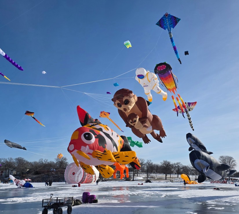 Winter kite flying season flew by, and what an adventure! Within two weeks frigid sub-zero temps hit the University of Okoboji Winter Games Kite Festival in Okoboji, IA before soaring all the way up to 50-plus degrees at Cool Kites on Ice in Detroit Lakes, MN.