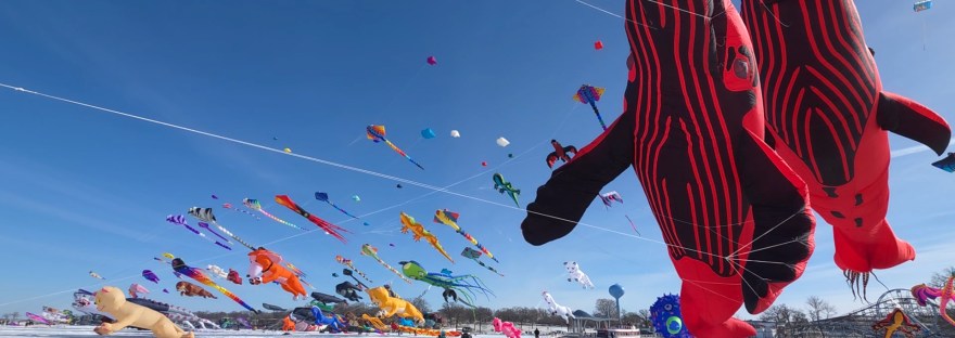 Winter kite flying season flew by, and what an adventure! Within two weeks frigid sub-zero temps hit the University of Okoboji Winter Games Kite Festival in Okoboji, IA before soaring all the way up to 50-plus degrees at Cool Kites on Ice in Detroit Lakes, MN.